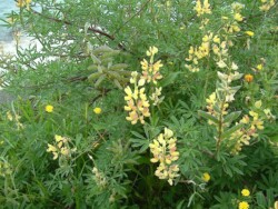 Blue lupin (Lupinus angustifolius) is a semi-woody annual with blue flowers (Aug-Apr) and is occasionally weedy. L. polyphyllus is also similar. Hybrid L. arboreus x polyphyllus has larger and more leaflets, flowers are yellow with blue or purple streaks and it is rarely weedy.